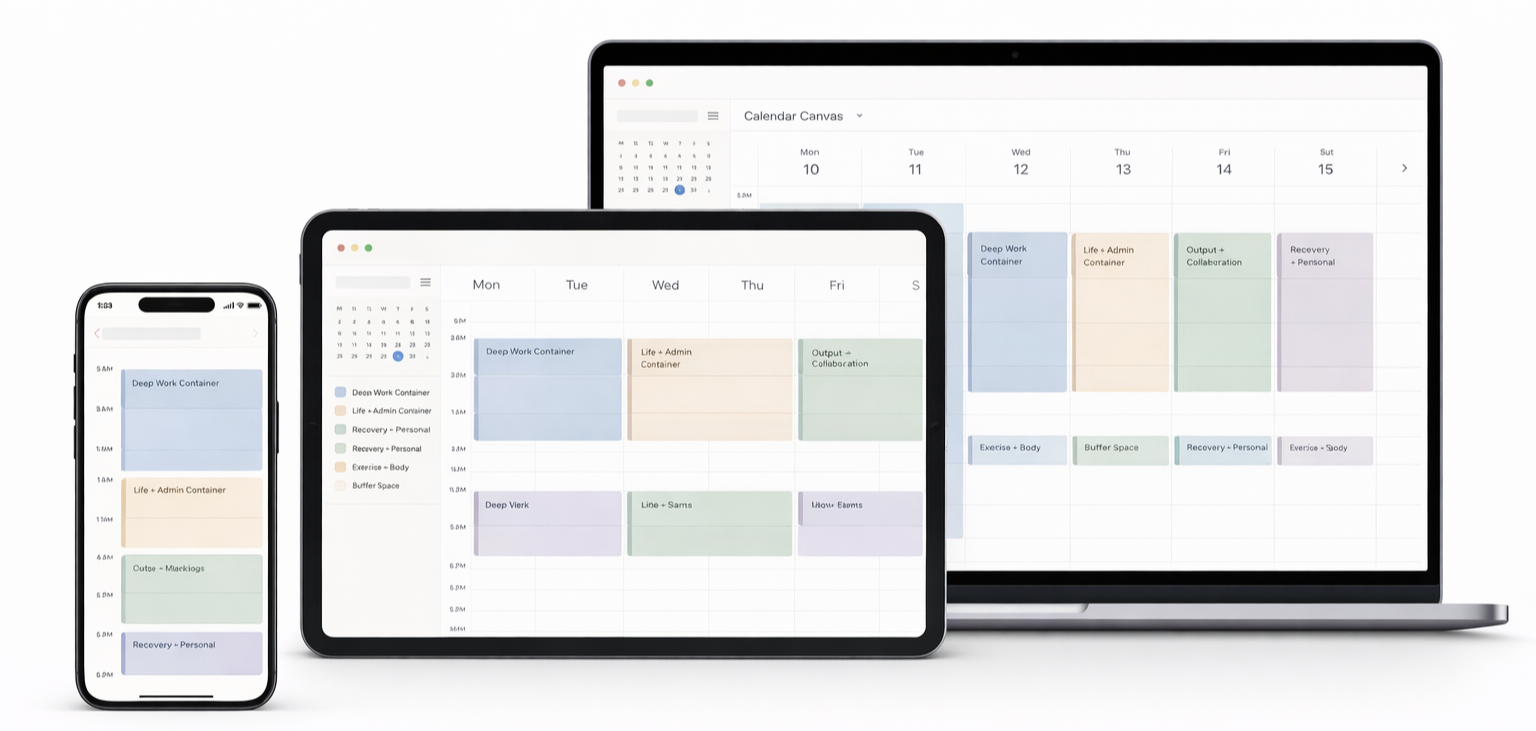 It doesn’t add another app or system to manage, it reorganizes the calendar you already use into a structure that reduces mental load. The goal isn’t optimization for output. It’s creating a schedule that actually feels sustainable to live inside.